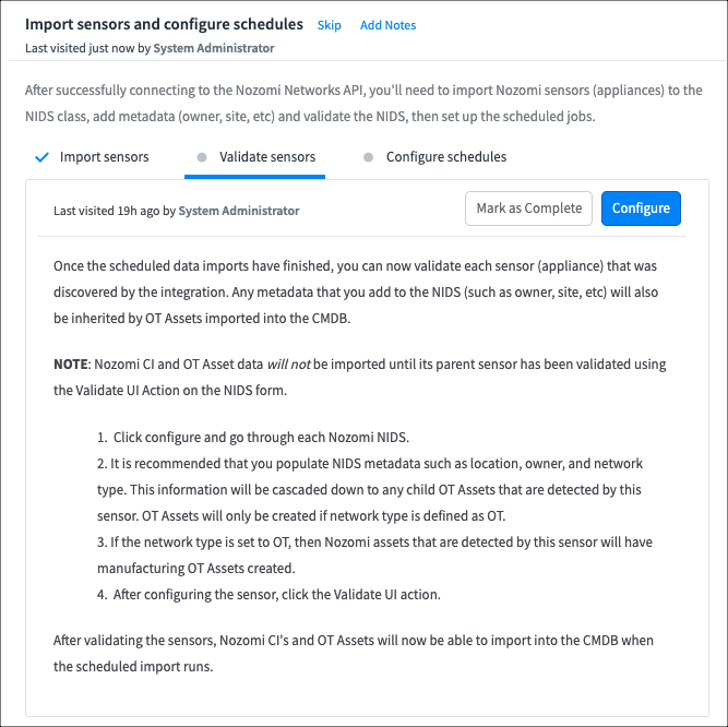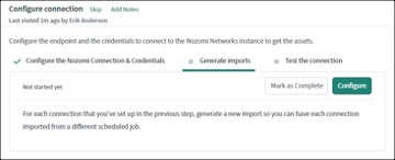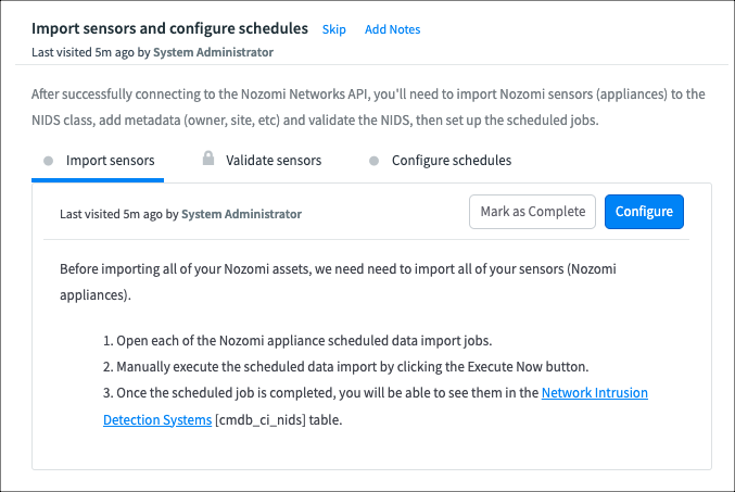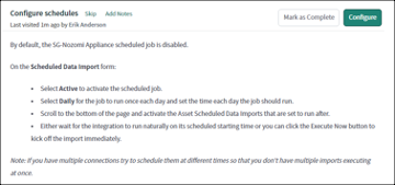 Note:You can also select Execute Full Import which will force a full import of Nozomi Networks data, regardless of the last import execution time. - Go back to the guided setup and select Mark as Complete.