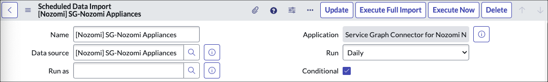 Note:You can also select Execute Full Import, which will force a full import of Nozomi Networks data, regardless of the last import execution time.