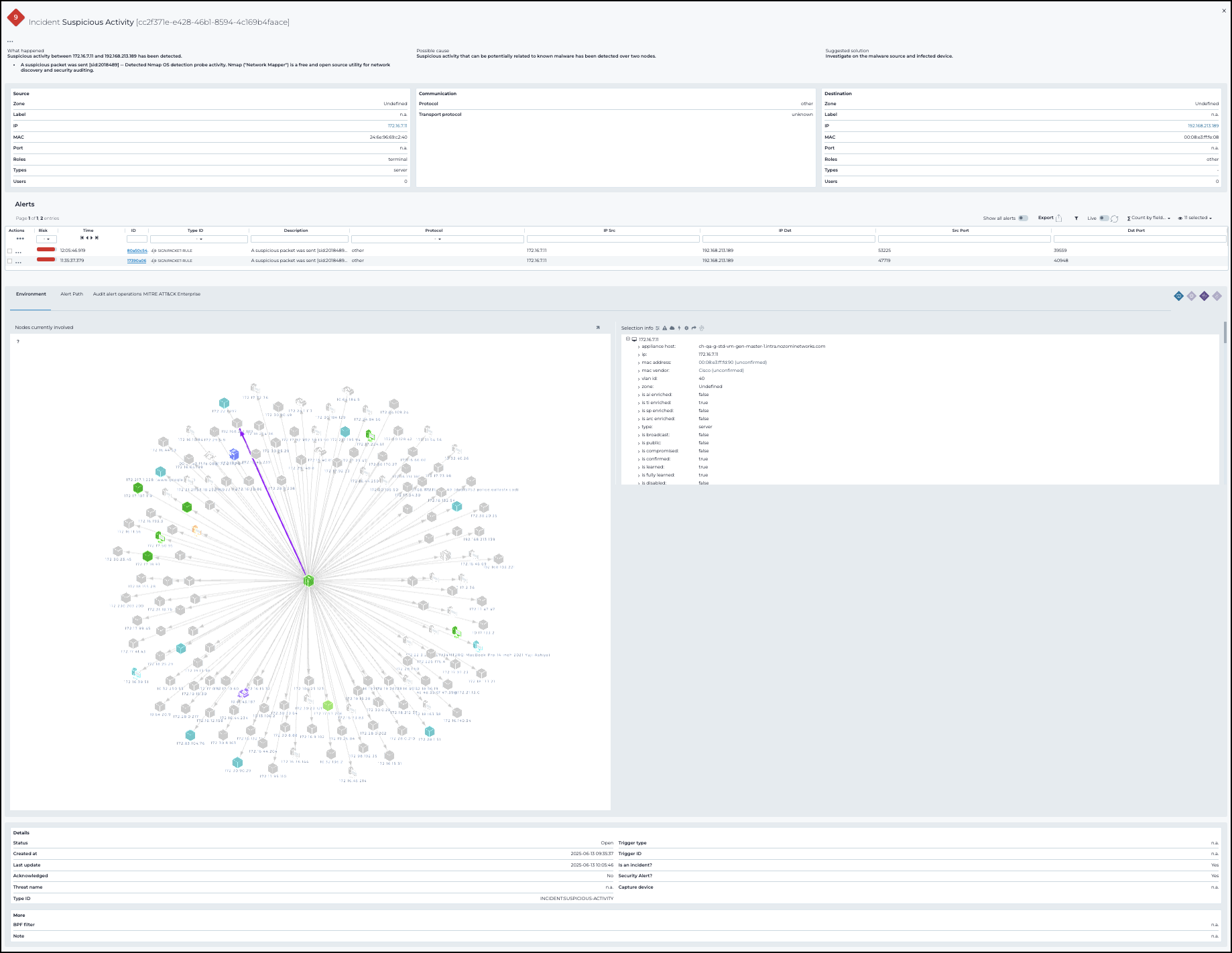 The Alerts details page provides a comprehensive view of a triggered alert, including cause, context, and recommended response. It displays communication paths, affected nodes, and relevant MITRE ATT&CK tactics. Use this page to investigate incidents and track alert handling activity.
