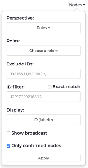 This indicates active graph filtering, when present. Filters can be from the filter bar (see R and S below), or activated from the zone/topology graph when you select a link/node in the zone/topology graphs. Once a filter is enabled with a value, the graph is automatically updated. If more than one filter is enabled, then a logical and criteria is applied. Only nodes that satisfy all of the specified filters are shown.