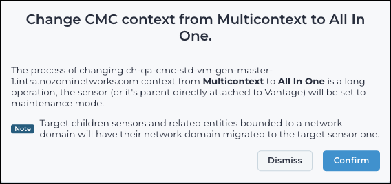 Change the context of a Central Management Console (CMC) from Multicontext to All-In-One or from All-In-One to Multicontext. This change affects how the CMC and its connected sensors operate within your network. Use the actions menu to initiate the change.